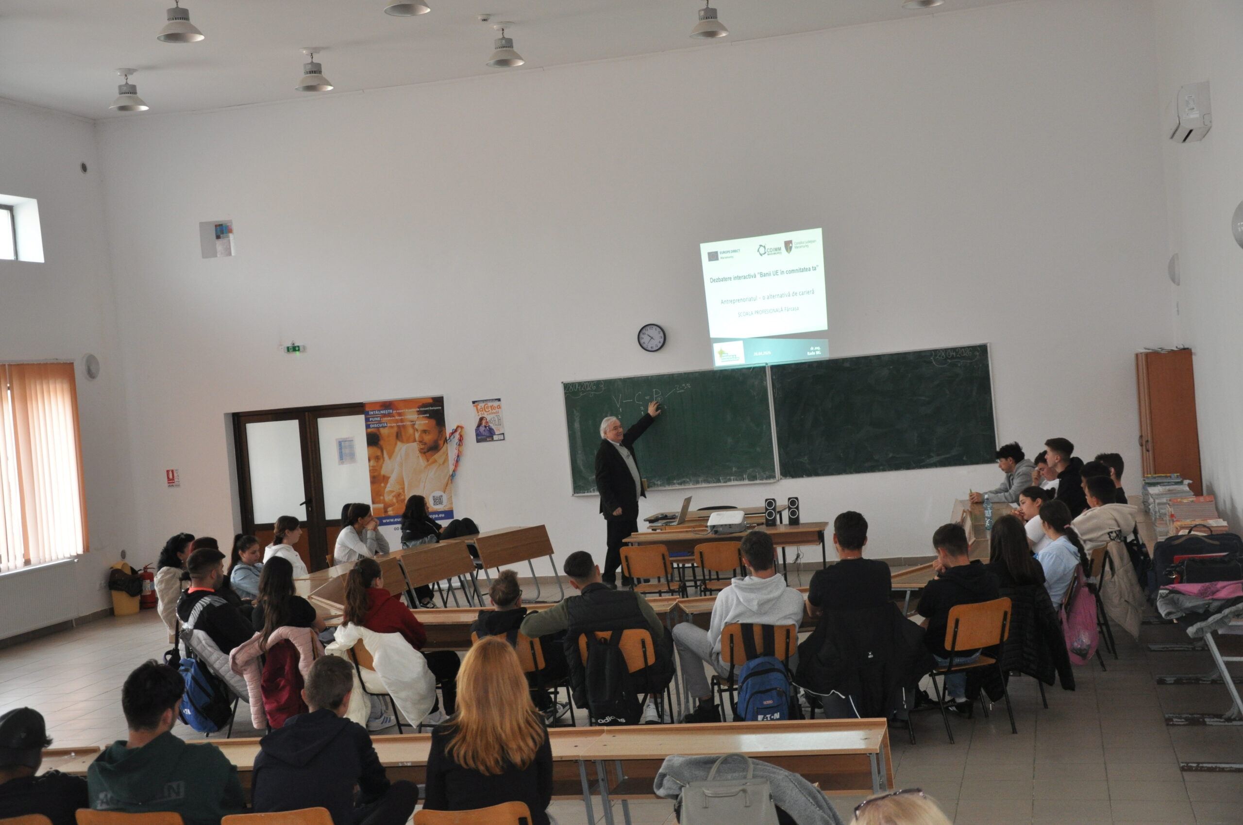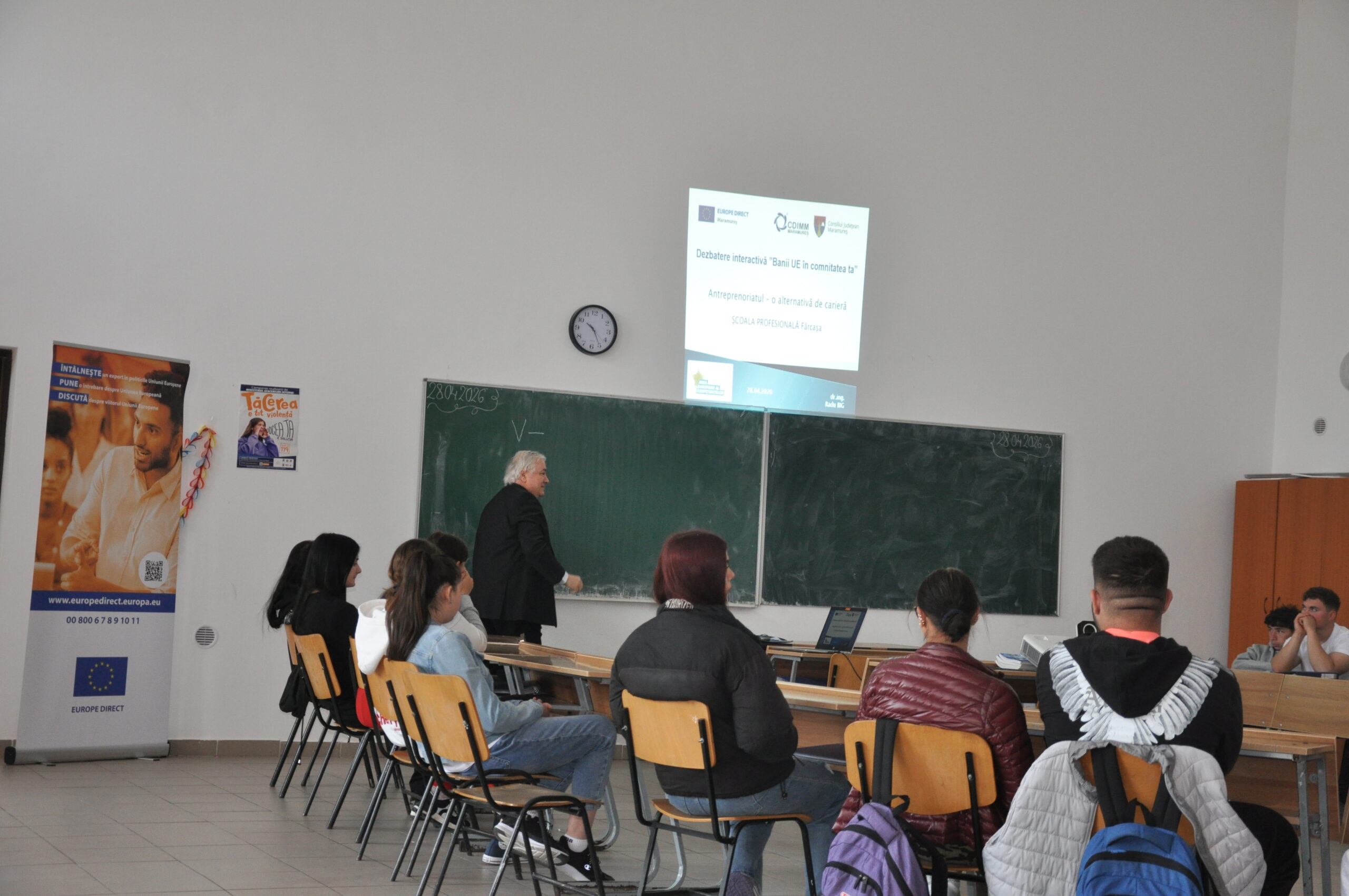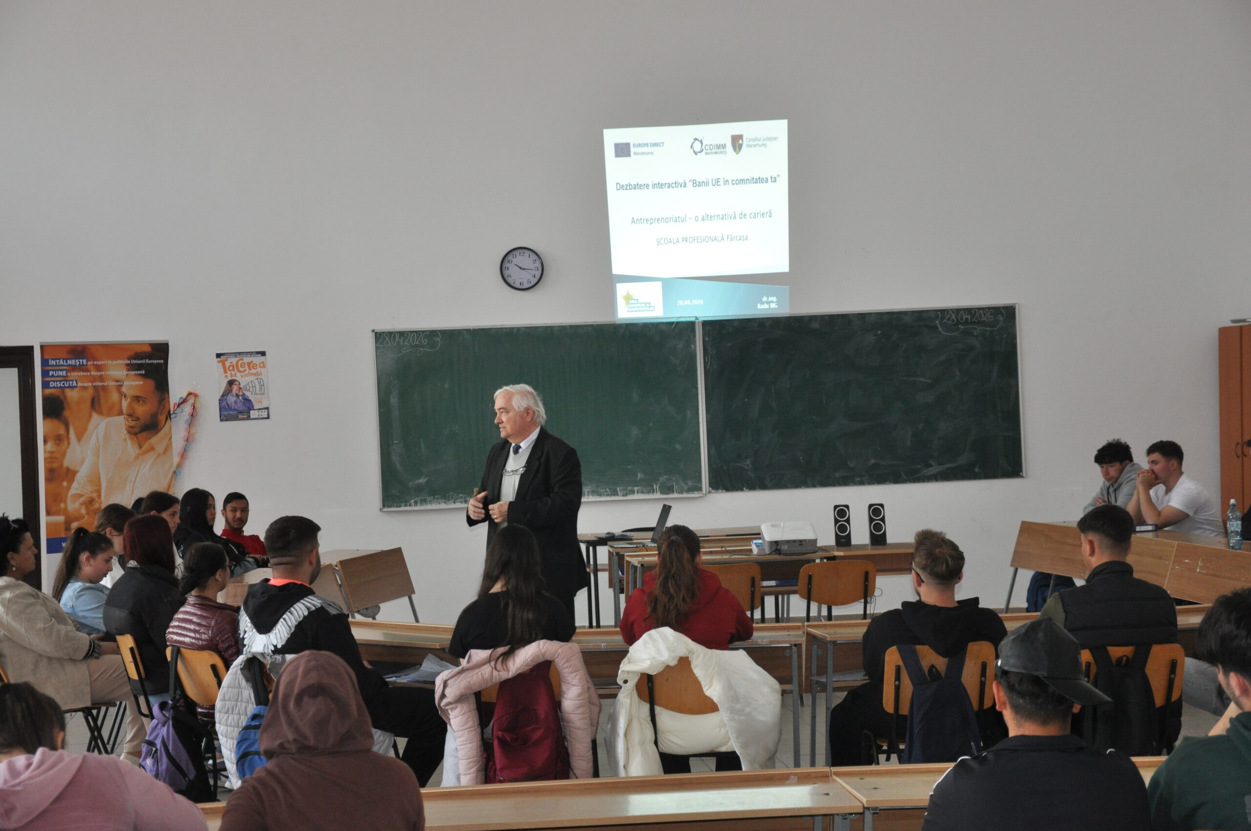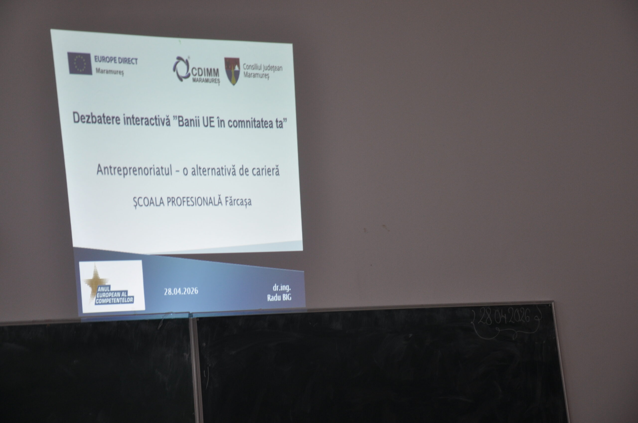 Marți, 28 Aprilie 2026, Centrul EUROPE DIRECT Maramureș a desfășurat o activitate în cadrul proiectului “Învață de la antreprenori” inițiat de Camera de Comerț și Industrie Maramureș, în colaborare cu Inspectoratul Școlar Județean Maramureș. Fundația CDIMM Maramureș, structura gazdă pentru Centrul EUROPE DIRECT Maramureș, furnizor autorizat de cursuri de competențe antreprenoriale, cu 30 de ani de experiență în consultanță în afaceri, face parte din această inițiativă județeană. Din această perspectivă, am realizat, în parteneriat cu Școala Profesională Fărcașa, “O întâlnire de educație antreprenorială”, începând cu ora 11:00.
